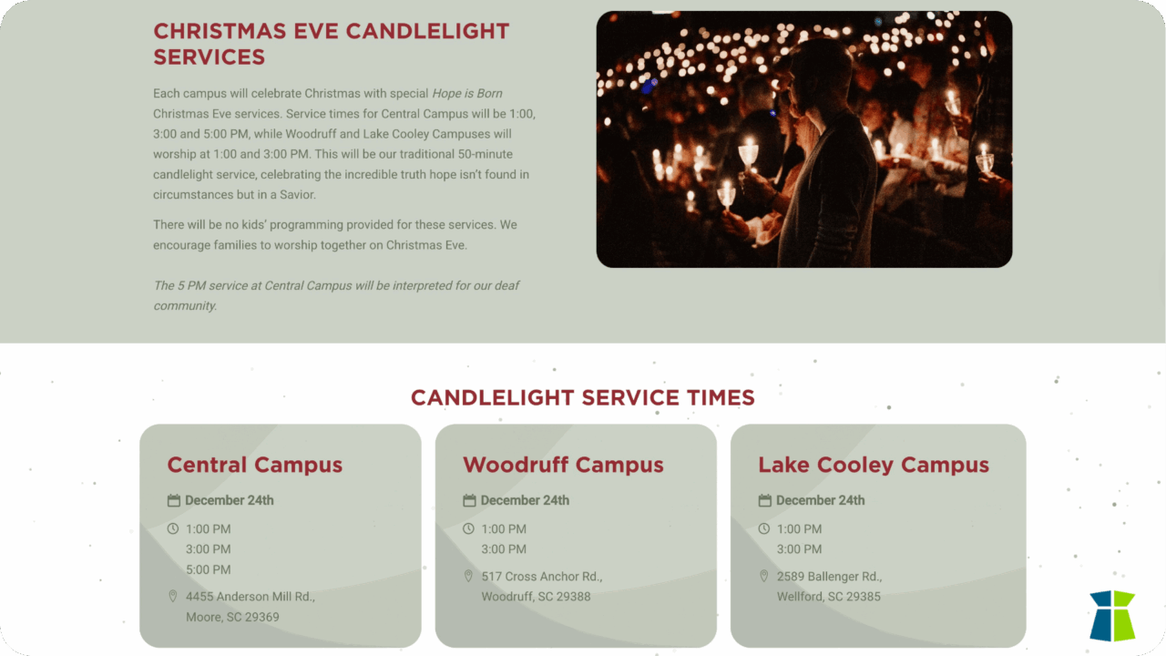 Church at the Mill (South Carolina) provides one of the clearest examples of multi-campus communication. Their Christmas landing page features dedicated sections for each campus with service times, event details, and clear Call to Actions (CTAs). Their design minimizes confusion and supports both first-time guests and committed members navigating a full holiday schedule.