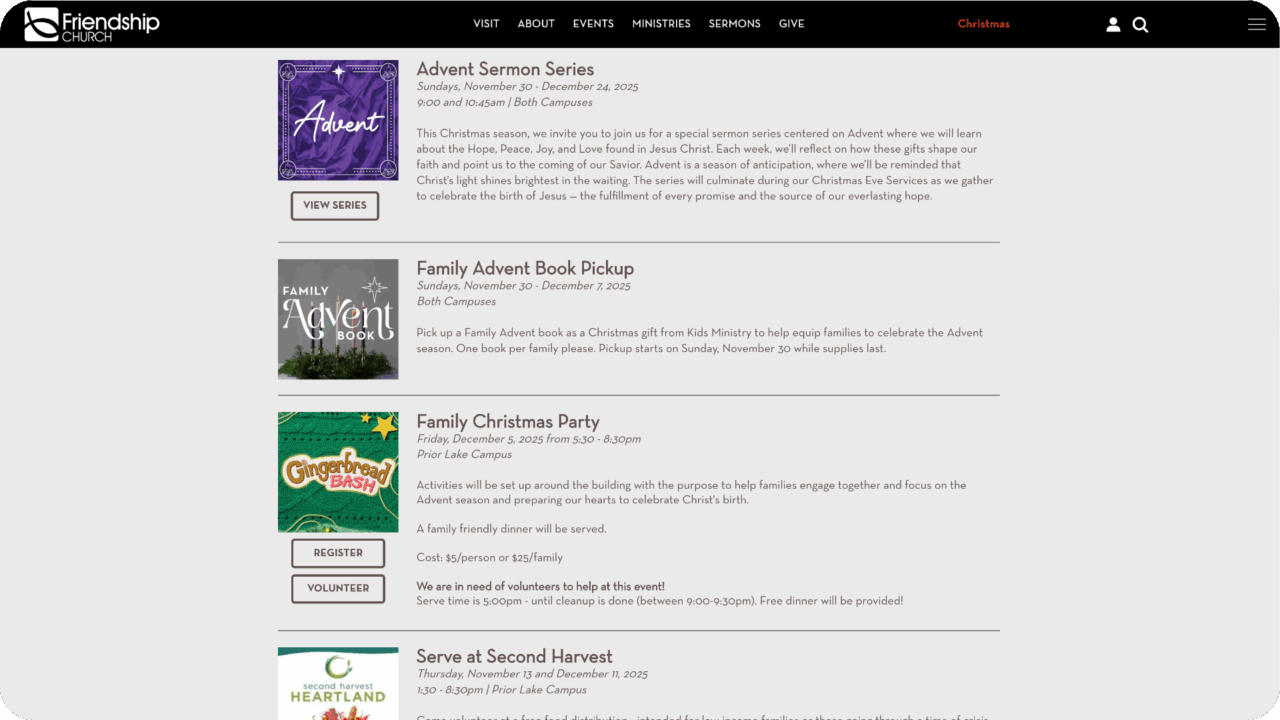 Friendship Church (Prior Lake & Shakopee, MN) demonstrates this beautifully. Their Christmas page organizes events with simple titles, approachable descriptions, and clear pathways to learn more. Guests can quickly grasp what the church is offering without being overwhelmed by information.