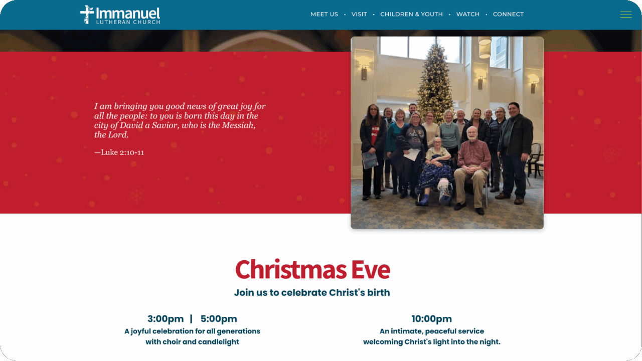 When people land on a Christmas page, the very first detail they look for is service times. If guests can see these quickly (without scrolling, digging, or clicking), they’re far more likely to plan their visit with confidence.