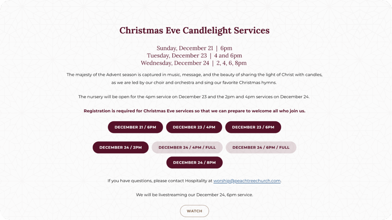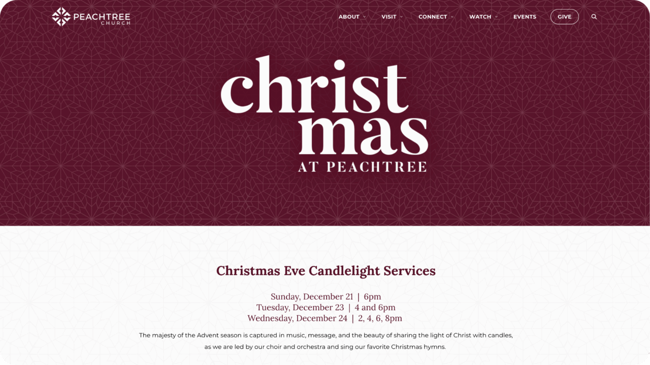 Peachtree Church (Atlanta, GA) excels in this area. Their Christmas landing page places service times front and center in a clean, easy-to-read way. This immediate clarity builds trust and helps guests make quick decisions.