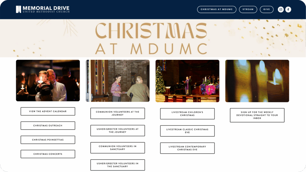 Memorial Drive UMC (Houston, TX) sets a strong example with easy navigation that allows visitors to jump directly to the section they need. Their page uses intuitive anchor links and clean section headers to guide guests smoothly through the content. Whether someone is looking for Christmas Eve services, family events, or holiday outreaches, they can find the right place with ease.